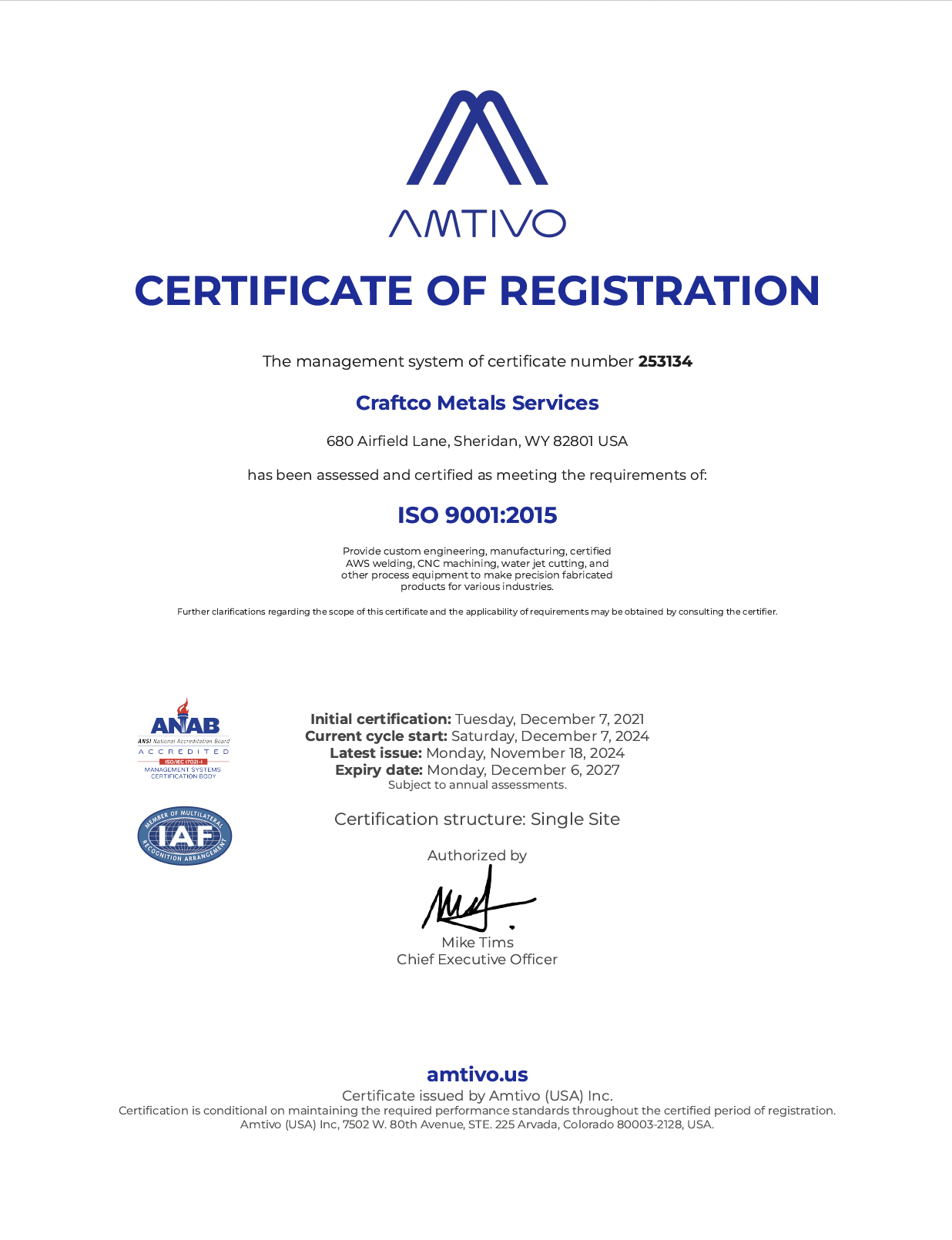 This internationally recognized certification demonstrates our commitment to delivering consistent, high-quality manufacturing solutions that meet customer and regulatory requirements. From precision welding to CNC machining and large-scale outsourcing, you can trust that Craftco’s processes meet rigorous quality standards every step of the way.